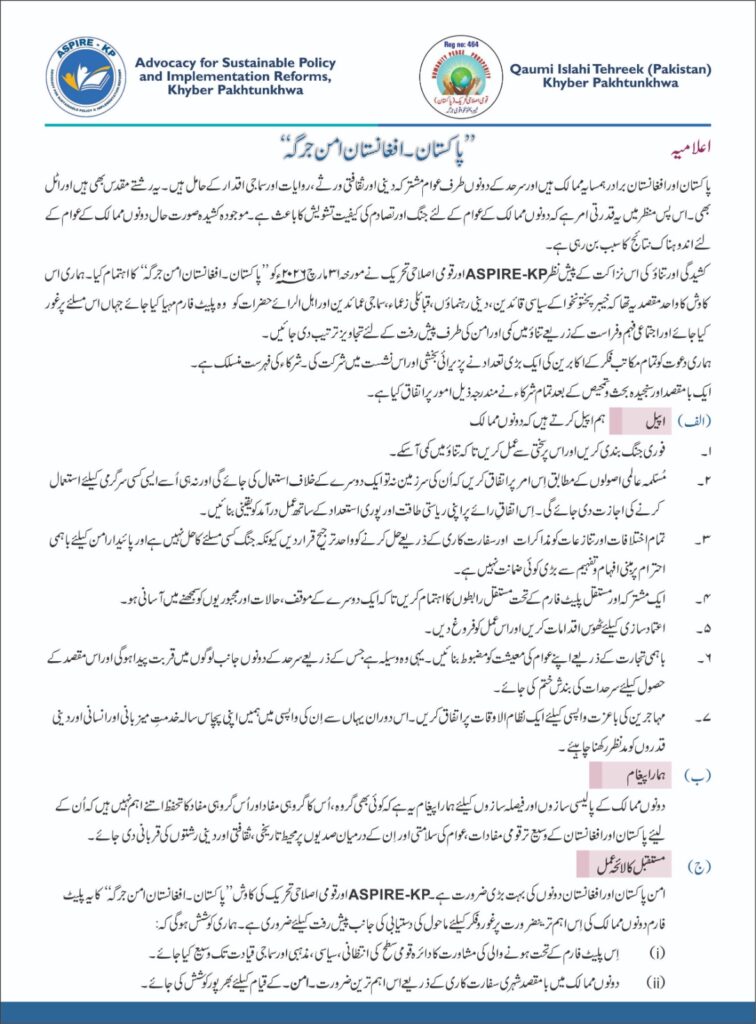 Pakistan- Afghanistan Peace Jirga held on 31 March at Peshawar After a meaningful and candid discussion, all participants agreed on